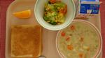 シナモントースト、クラムチャウダー、コーンサラダ、オレンジ、ぎゅうにゅう |