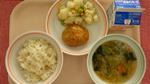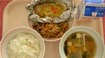ごはん、わふうれんこんハンバーグ、コーンポテト、みそしる、ぎゅうにゅう |