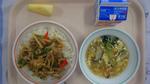 チンジャオロース丼、たまごと春雨のスープ、りんご、牛乳 |