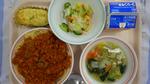 スパゲッティボロネーゼ、コーンサラダ、白菜とハムのスープ、スイートビーンズポテト、牛乳 |