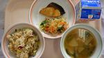 秋の香りご飯、ししゃものこうみやき、からし和え、味噌汁、はちみつレモンゼリー、牛乳 |