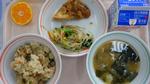 メキシカンピラフ、鶏のピリ辛焼き、コンソメスープ、オレンジ、牛乳 |