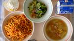 ツナとトマトのスパゲッティ、じゃこと小松菜のサラダ、ポテトスープ、かぼちゃプリン、牛乳 |