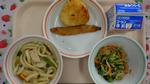味噌焼きおにぎり、五目うどん、ししゃもフライ、ザーサイ和え、牛乳 |
