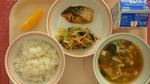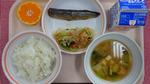 ごはん、サバの辛味焼き、なめたけ和え、いものこ汁、オレンジ、牛乳