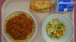 スパゲッティミートソース、コーンサラダ、アップルデニッシュ、牛乳 |