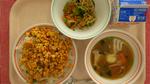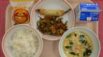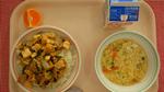 厚揚げ入り豚キムチ丼、中華コーン卵スープ、みかん、牛乳 |