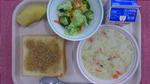 セサミトースト、クラムチャウダー、フレンチサラダ、バナナ、牛乳 |