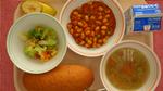 胚芽パン、チリビーンズ、コーンサラダ、コンソメスープ、バナナ、牛乳 |