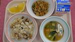 コッペパン、チリビーンズ、海藻サラダ、コンソメスープ、バナナ、牛乳 | たけのこご飯、いわしの香草フライ、梅おかか和え、豚汁、オレンジ、牛乳 | みそラーメン、わかさぎのフリッター、コーンサラダ、チョコチップバナナケーキ、牛乳 |
