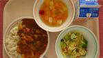 チキンカレーライス、チップスサラダ、フルーツポンチ、ぎゅうにゅう |