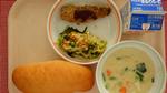 コッペパン、いわしのこうそうフライ、かむかむサラダ、ふゆやさいのチャウダー、ぎゅうにゅう |