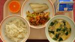 ごはん、とりのみぞれかけ、もやしとこまつなのごまずあえ、みそしる、オレンジ、ぎゅうにゅう |