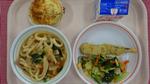 キムチうどん、ししゃものフリッター、海藻サラダ、さつまいもとりんごのケーキ、ぎゅうにゅう |