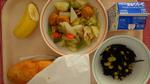 オムライス、はちみつドレッシングサラダ、ポテトスープ、一口ぶどうゼリー、牛乳 |