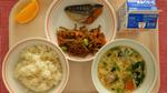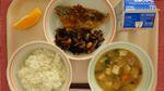 ごはん、あじの香味ソースかけ、大豆とひじきの煮物、豚汁、オレンジ、牛乳 |
