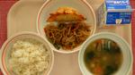 ごはん、揚げ餃子、春雨のピリ辛いため、トック入りスープ、牛乳 |