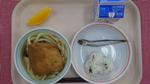 ごしきおにぎり、きつねもちうどん、ししゃものこうみやき、オレンジ、牛乳 |