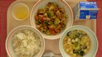 ごはん、ホイコーロー、サンラータン、りんごゼリー、牛乳 |