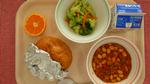 ツナとチーズのホイルサンドパン、フレンチサラダ、チリビーンズ、みかん、牛乳 |