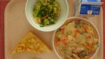 大豆とベーコンのピラフ、シチューのパイ包み、海藻サラダ、牛乳 |