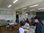 家庭科室では5年生が調理実習です。青菜を茹でる学習でした。班ごとに調理台を使い、ほうれん草を茹でました。包丁で切って盛り付けおしょうゆと削り節でお浸しにして試食です。「おいしくできました。」と答えてくれました。