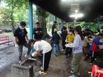 昨日の野外炊飯場へ移動して焼きプレート作りです。杉板に障子のりで文字を書き、ガスバーナーで焼き目を付けました。お土産として大事そうにしまっていました。続いてプレイハウスでASEのゲームです。協力して課題をクリアしようとチャレンジしていましたが、昨日よりも難しいものもありました。