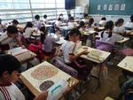 3年生は2学級とも図工でした。四つ切サイズの大きな用紙に描いています。主役となるものを大きく描いていました。ヒマワリを大きく描き種の部分を様々な絵の具の色を載せていっています。もう1学級は海の生き物を主役に書きます。イルカやジンベイザメなどタブレットで探した写真を参考に描いていました。3時間目は校庭で学年体育でした。体力テストの20mシャトルランを計測しました。昨年度よりも記録が伸びたかな?