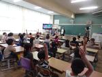 2年生に食育で栄養教諭の先生が読み聞かせをしてくれました。赤、黄、緑の食材をバランスよくとることについてのお話でした。画面に映った絵をよくよく見ていました。