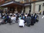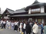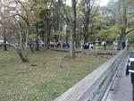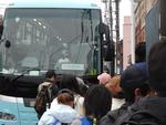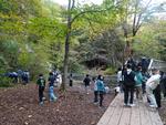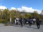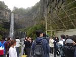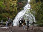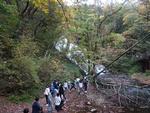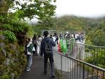 バスで湯滝へ移動しました。滝の近くまで行って、音を立てて流れ落ちる滝を見学しました。水辺近くで流れてくる水を触ってもみました。湯滝の駐車場は修学旅行のバスがいっぱいでした。
