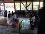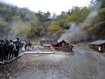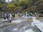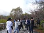 バスから湯ノ湖を見てホテルに到着。入館式を行いホテルの方へご挨拶をしました。足湯につかり、源泉散策もしました。硫黄の温泉なのでゆで卵のようなにおいでした。ホテルへの帰り道でシカが草を食んでいる様子を見ることができました。