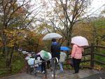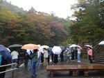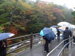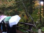 少し早めにバスに乗り込みホテルを後にしました。バスで戦場ヶ原を見ていましたが今日は雲が厚く男体山も見えませんでした。竜頭の滝上でバスを降り、川の流れに沿って下っていきます。気温が低く紅葉もちらほら見られました。滝下で水音を上げて流れる滝を見てバスに乗りました。