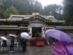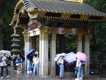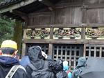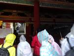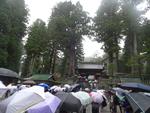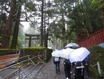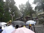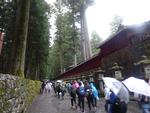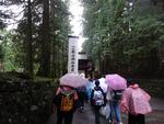 中禅寺湖を通りいろは坂を下ります。カーブから雲海が見えました。輪王寺の駐車場でバスを降りました。東照宮への参道では、今日行われる流鏑馬の準備中でした。東照宮は修学旅行生、観光客の方で大混雑でした。雨も降っているので傘にも注意して動きます。全員で鳴き竜を見学したら班で行動です。三猿、陽明門、拝殿、眠り猫、奥宮などを見学して回りました。五重塔前で集合して昼食場所へ向かいました。