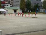 土曜、日曜としっかり雨が降ったので地面が湿っています。まだ水たまりもある南部小です。5年生が、水たまりを上手に避けて校庭で体育でした。テニスに似たテニピンで運動しました。