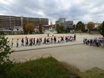 1,2年生が、持久走大会で走るコースを歩いて確認しました。カーブや狭くなっている場所、お友だちを抜くときなどについて気を付けることを担任の先生から聞いていました。1年生は初めての体験です。2年生も思い出していました。