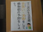 続いて今月の生活目標です。今年のインフルエンザは感染力が強い型と合わせて3種類が流行しているので1度かかっても別の型に方にかかるかもしれないこと。教室の換気をすること。飛沫感染を防ぐため、咳エチケットでマスクをつけることが有効なこと。『手洗い・消毒をして感染症の予防をしよう』の生活目標について大事なことを養護教諭からのお話でした。