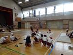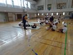 体育館の空調工事はもう少し続きますが、一部フロアは使えるようになりました。安全を確認しながら体育授業などを行っています。4年生がマット運動を行っていました。マットの技につなげるため「ゆりかご」などのドリル運動を始めていました。