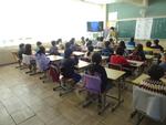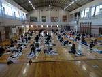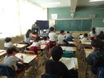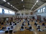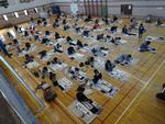 5,6年生は体育館です。墨汁を使い、長い書き初め用紙に筆で書きます。5年生は「美しい空」、6年生は「新春の朝」です。文字の字形だけでなく用紙へ書く時の字の配置も考えて書いていました。6年生は小学校生活最後の書き初めとなります。