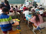1年生は2クラスとも国語でした。動物が活躍する本の紹介をする「おはなしどうぶつえん」で絵本を読み進めていました。もう1クラスは、「くっつきのを・へ」の復習をプリントでしていました。2年生も国語でした。図書室で本を返却していました。学校図書館専門員の先生に返す棚を教えてもらっていました。もう1クラスは詩の内容について自分ならどう書くかを考えていました。