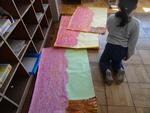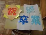 4組は生活単元学習で作品を作っていました。布を丸めてスタンプのように絵の具を押したり手形を付けた画用紙を切り取ったりしました。指先をつかって折り紙をちぎり台紙に貼っていきました。卒業式や入学式に掲示する作品です。楽しみながら力を付けています。