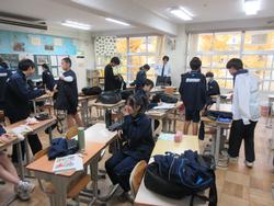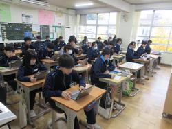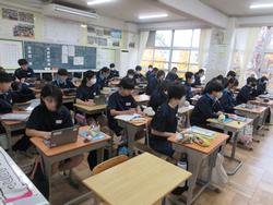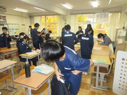 朝の教室の風景は慌ただしいです。部活動を終えた生徒は汗をぬぐい、ギリギリに登校した生徒は慌てて準備をしています。どうしても毎日少し間に合わない生徒もいます。教室の中は8時15分には着席し読書などが始まります。月曜日(連休明けは特に)は残念なことに体調不良等の欠席者が多く、教室にも空いた机が目立ちます。インフルエンザの大きな流行は来ていませんが、徐々に寒い日が増えてきているので学校に気持ちが向かない生徒も増えてきます。体調管理はもちろんですが、十分な睡眠とバランスの良い食事で健康バランスと心のバランスを整えてほしいです。今週が終わるといよいよ12月に入ります。学校で今年の締めくくりをしっかり行ってほしいです。