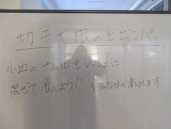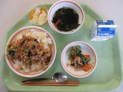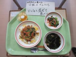 給食は「切り干し大根のビビンバ」「ビビンバナムル」も一緒に混ぜて食べ応え万点でした。