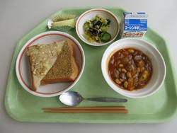 今日の給食は2種類のトースト。ツナポテトチーズと白ごまハニーはタイプの違うトーストで得した気分でいた。チリコンカン風のシチューもおいしかったです。今日も昨日に引き続き残菜が少ないといいです。