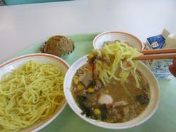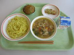 今日の給食は味噌ラーメン。つけ麺になっていて具だくさんの汁につけて食べました。抹茶と里芋のケーキもボリュームがありおいしくいただきました。