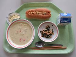 今日の給食はチリビーンズドックとコーンクラムチャウダー、ツナ入りのサラダ、リンゴ、牛乳でした。