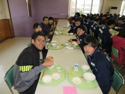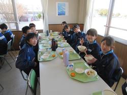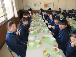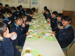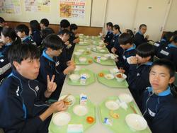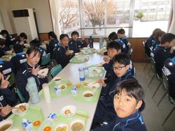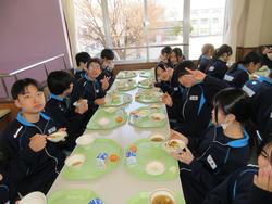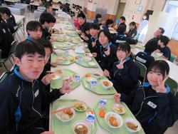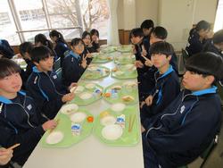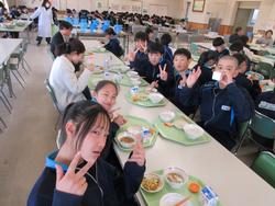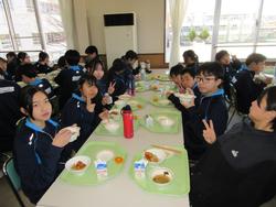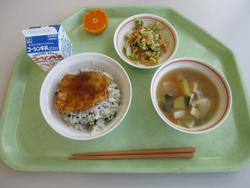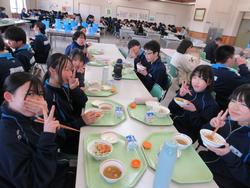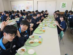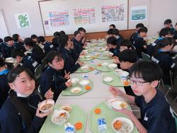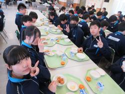 今日の給食は千葉県産ハーブ鳥のスタミナ丼、子ぎつね切り干し大根サラダ、千葉の恵みたっぷりみそ汁、みかんです。野菜もたっぷりの彩のよい給食でした。みんな笑顔で食べておかわりも完食でした。全校生徒で食べられる給食はいいですね。