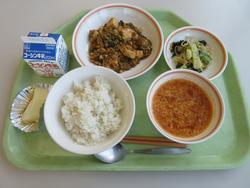 今日の給食は2年生の家庭科で考えたメニューです。マーボー豆腐、サラダ、トマトとたまごのスープおいしかったです。