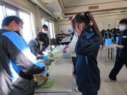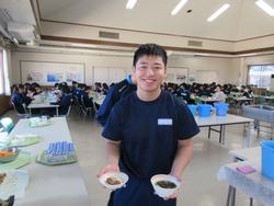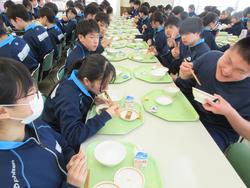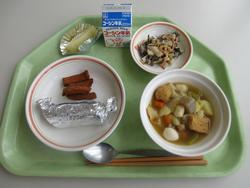 今日の給食は「ハムチーズロール、きなこかりんとう付、洋風おでん、大根とツナのごまサラダ、リンゴ」