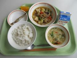 今日の給食は「ごはん、揚げ出し入り肉じゃが、ししゃもの照り焼き、かきたま汁、デコポン」です。