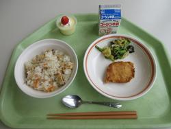 メニューは「五目ちらし寿司、鶏肉のから揚げ、小松菜のゴマ味噌和え、いちごプリン」です。